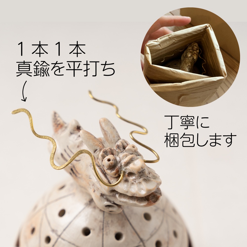 ヒゲの長さや形状も、1体ずつ異なる辰の表情やバランスに合わせて真鍮で平打ち。彫金と陶芸の組み合わせは、作品の温かみを一層盛り上げます。