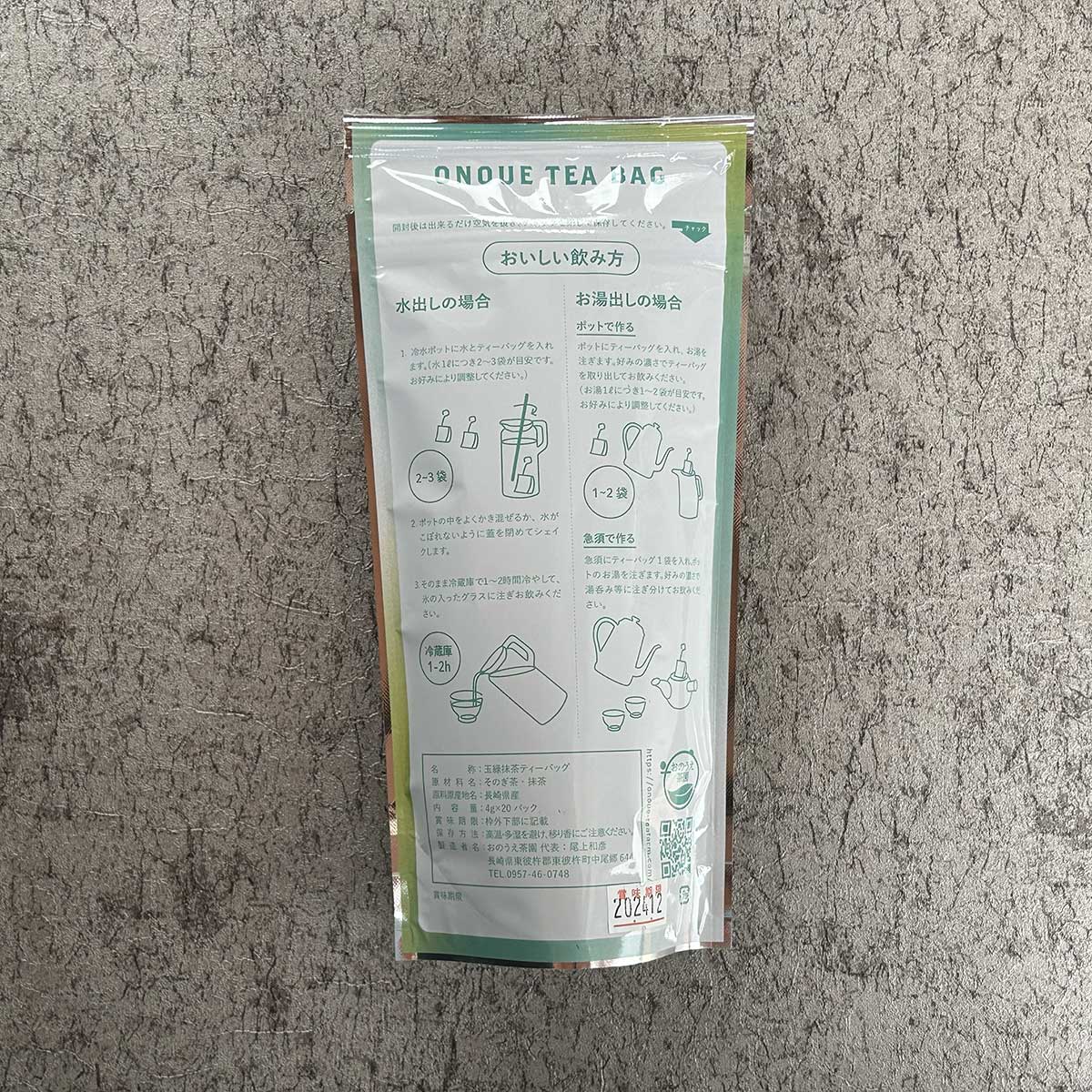●名称:玉緑抹茶ティーバッグ ●原材料名:茶、抹茶(長崎県東彼杵産) ●内容量:4g 20P ●賞味期限:別途商品ラベルに記載 ●保存方法:常温 ●製造者:おのうえ茶園