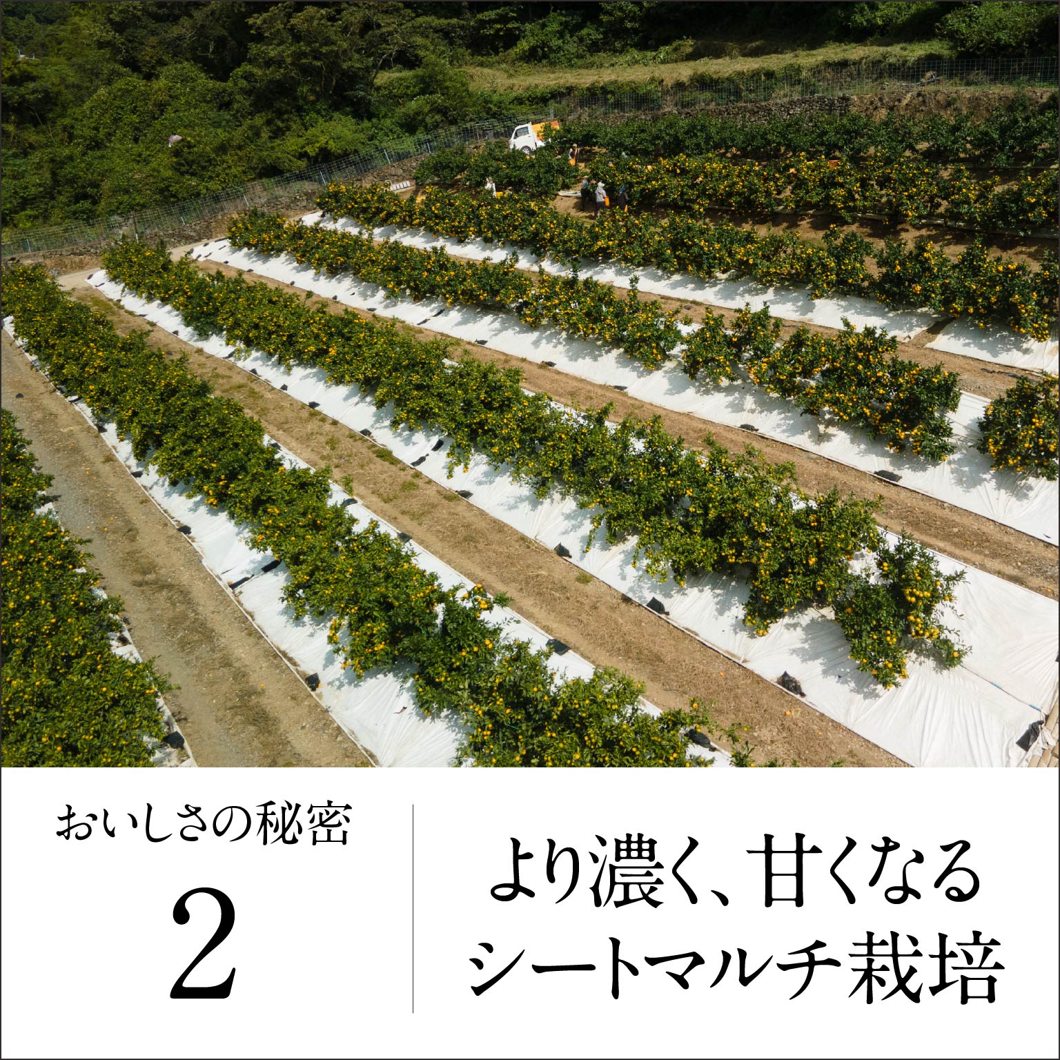 みかんの美味しさの大きな理由として挙げられるのが、木の根元、土を覆うように被せて雨が土に入りすぎないようにする「マルチシート」を用いた栽培法です。山田さんちのみかん畑でもこのシートマルチ栽培を採用されています。あえて水分を制限することで、濃厚で糖度の高いみかんが育ちます。白いシートは光を反射させるので、葉の光合成を促し、より美味しいみかんになるのです。