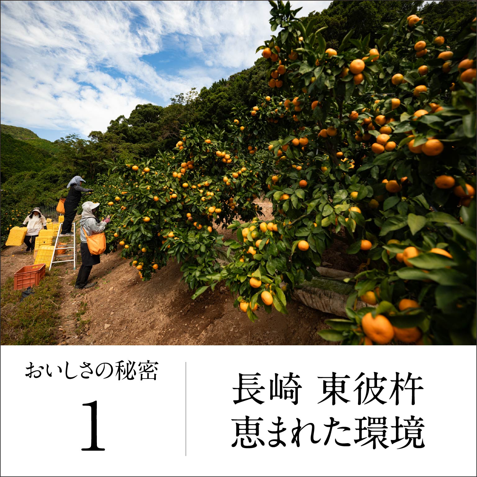 山田さんちのみかん畑は、長崎県の真ん中、穏やかな大村湾に面する東彼杵町の山間にあります。周囲に車道がない、空気のきれいな山の急斜面。温暖な気候に恵まれ、青々とした葉は太陽の光をたっぷり浴びて光合成を行い、その栄養を実へと注ぎます。急斜面にある理由は、その日当たりの良さと水はけの良さ。余分な水分が止まらず、美味しいみかんが育つのです。