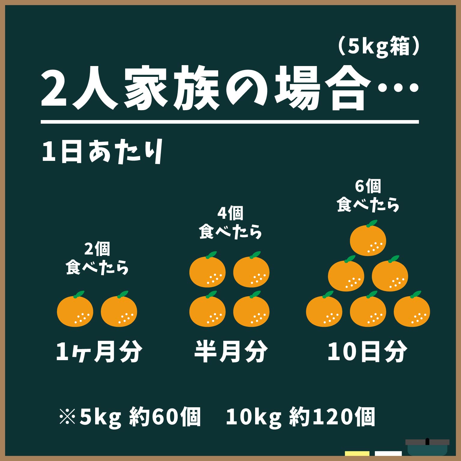 5kgのみかんを買ったとして、2人なら半月分!意外と、あっという間だと思いませんか? 箱買いが初めての方のために、計算してみましたので参考にされて下さい。差し入れやお裾分けにしても、とっても喜ばれるのでおすすめです。
