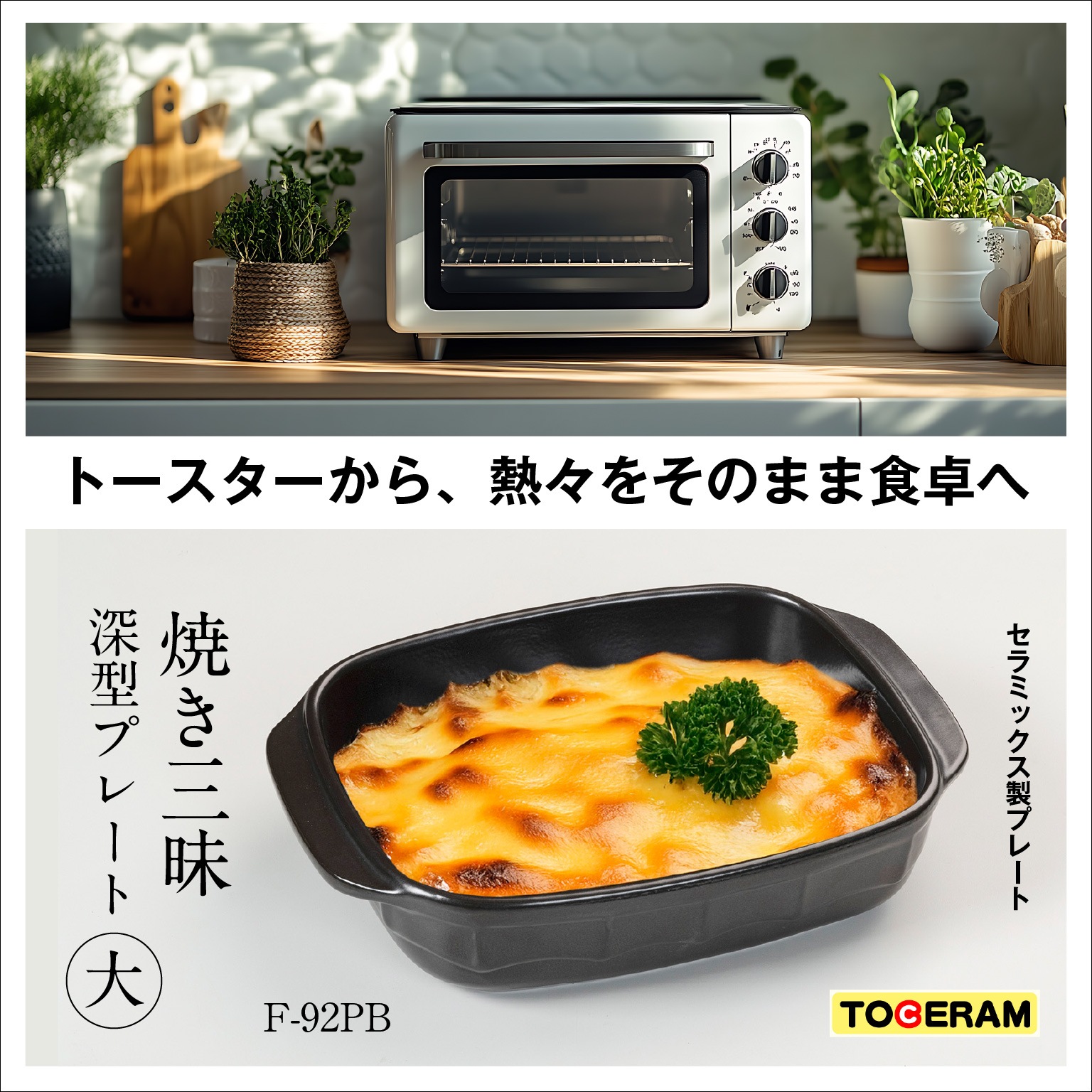 焼き三昧 深型は、ご家庭のトースターにちょうどいい大きさ!食材を入れてあとはタイマーにおまかせで、おいしい1品が出来上がります。熱々をそのまま食卓に出して使えるので、グラタン皿にも最適です。